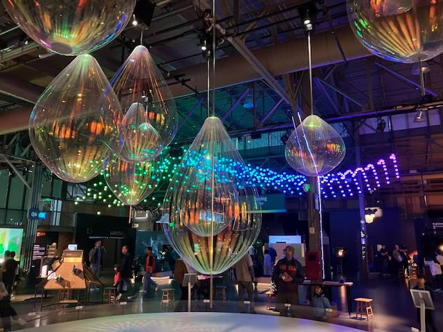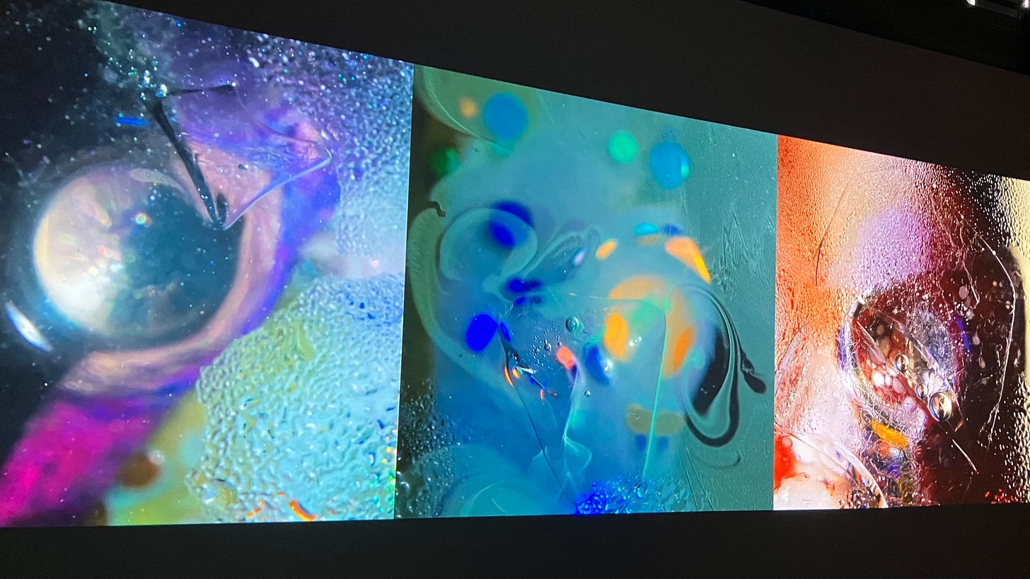 I arrived on a Tuesday during winter break, and the place was mobbed. By the time I reached the Glow exhibits I was exhausted, but managed to see seven of the eight featured artists. All the works were luminous and interesting, but like so much art made of LEDs and circuits, most seemed somewhat soul-less to me. One exception was Akiko Nakayama’s 2024 “Alive Painting,” entitled The Thawing of... Composed of three screens aligned in a darkened room, the eight-minute film showed various materials in states of evaporation, sublimation, and metamorphosis. The colors and ever-changing shapes were mesmerizing.