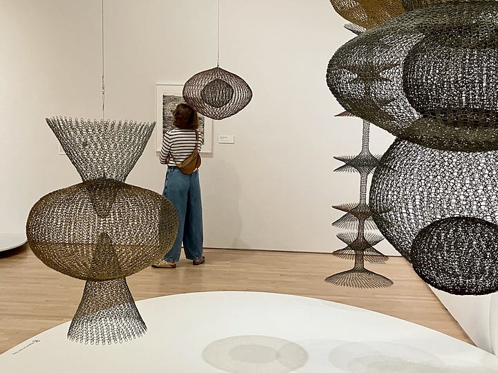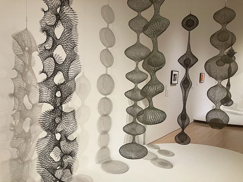 I’ve found that many works of art (and maybe this is true of most art) deepen the more time you spend with them. At SFMOMA I had the opportunity to really focus on Asawa’s hanging wire sculptures. The longer I looked at them, the more they revealed themselves as trans-dimensional containers, able to hold space in different shapes, sizes and forms — not just in the metaphorical sense, but also literally.